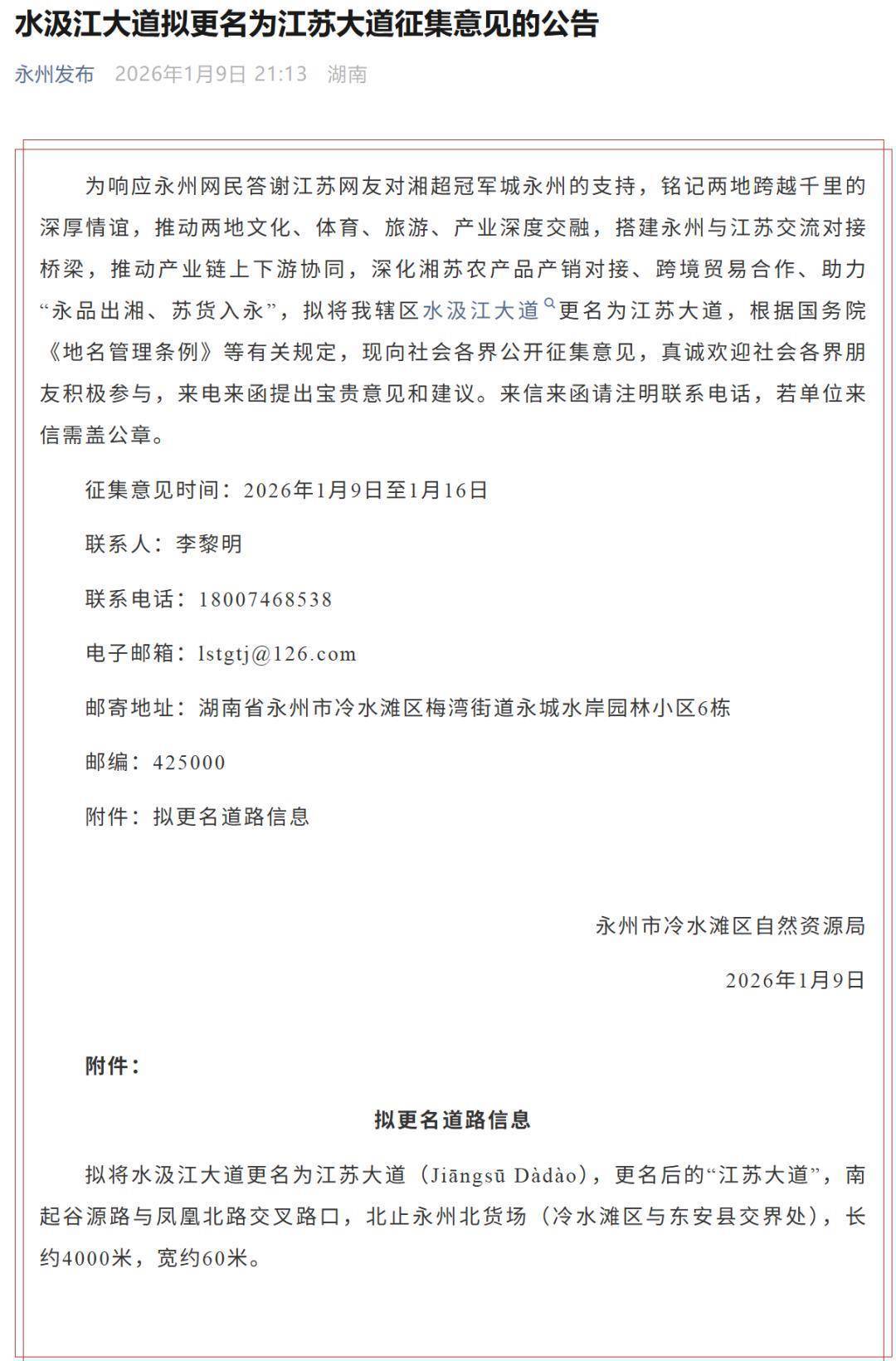 1月9日,湖南永州市冷水滩区自然资源局发布公告:为响应永州网民答谢江苏网友对湘超冠军城永州的支持,铭记两地跨越千里的深厚情谊,推动两地文化、体育、旅游、产业深度交融,搭建永州与江苏交流对接桥梁,推动产业链上下游协同,深化湘苏农产品产销对接、跨境贸易合作、助力 “永品出湘、苏货入永”,拟将我辖区水汲江大道更名为江苏大道,根据国务院《地名管理条例》等有关规定,现向社会各界公开征集意见,真诚欢迎社会各界朋友积极参与,来电来函提出宝贵意见和建议。来信来函请注明联系电话,若单位来信需盖公章。